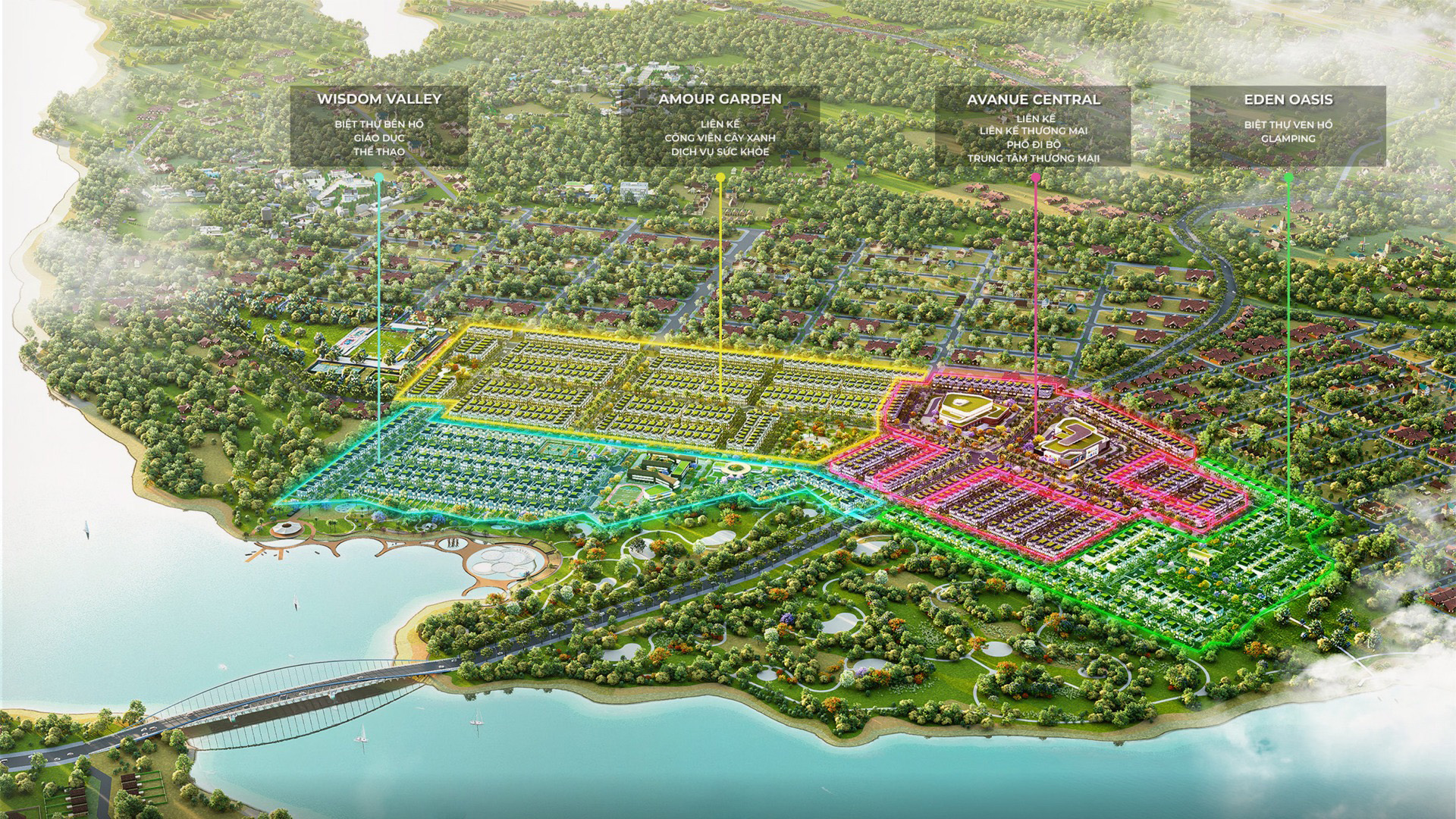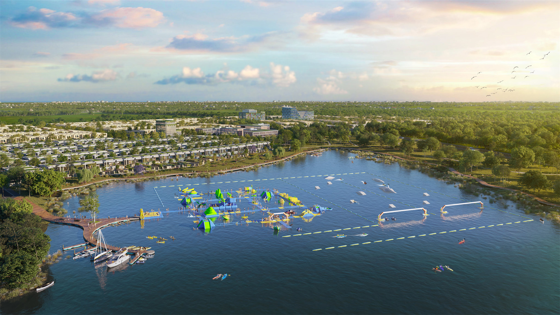 Trên quỹ đất rộng hơn 55 ha, dự án được bao quanh bởi hồ sinh thái và mảng xanh tự nhiên, mang đến không gian sống trong lành, cân bằng. Các phân khu được bố trí khoa học, gồm đất nền nhà phố, biệt thự và khu nhà ở xã hội, hài hòa giữa nghỉ dưỡng và an cư.