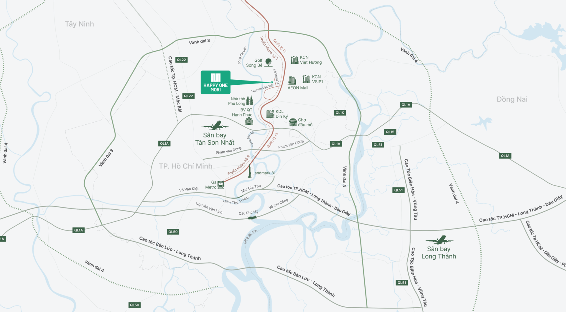 Nằm trên trục đường Lái Thiêu 14, Happy One Mori sở hữu vị trí chiến lược hiếm có tại cửa ngõ Đông Bắc TP.HCM. Nơi đây không chỉ là chốn an cư lý tưởng mà còn là cơ hội đầu tư giàu tiềm năng, khi nằm liền kề các tuyến giao thông huyết mạch như Quốc lộ 13, Vành đai 3 và tuyến Metro số 2 trong tương lai.