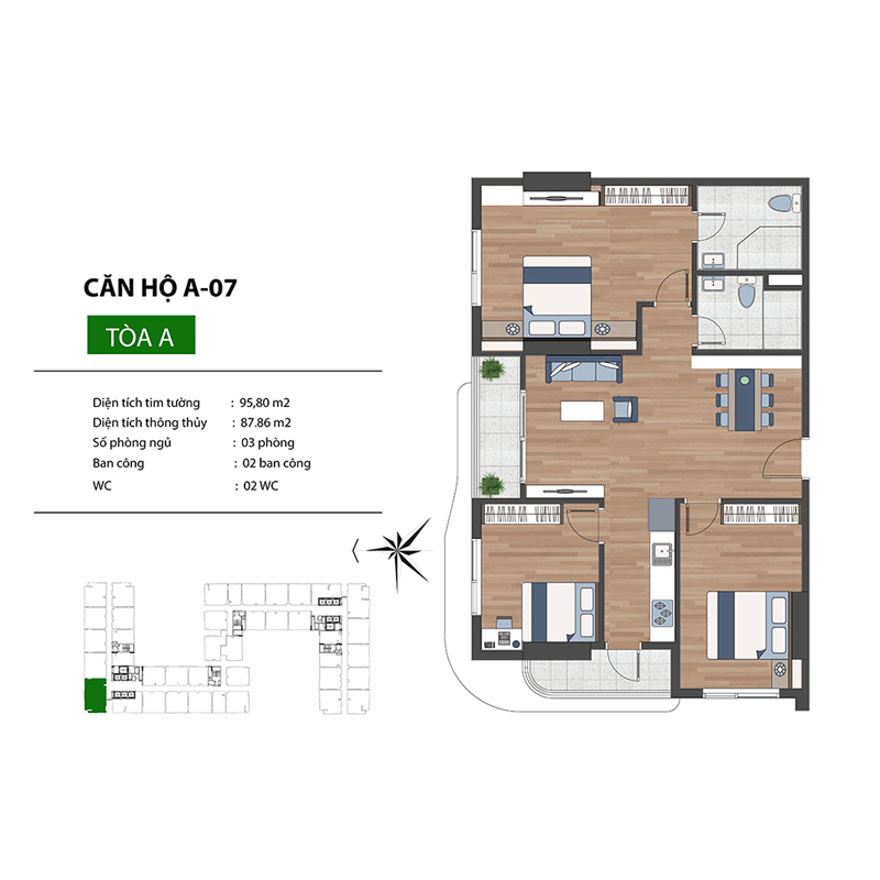 🏡 Diện tích: 95m² – Thiết kế 3 phòng ngủ, 2 phòng vệ sinh, căn góc 2 view thoáng mát