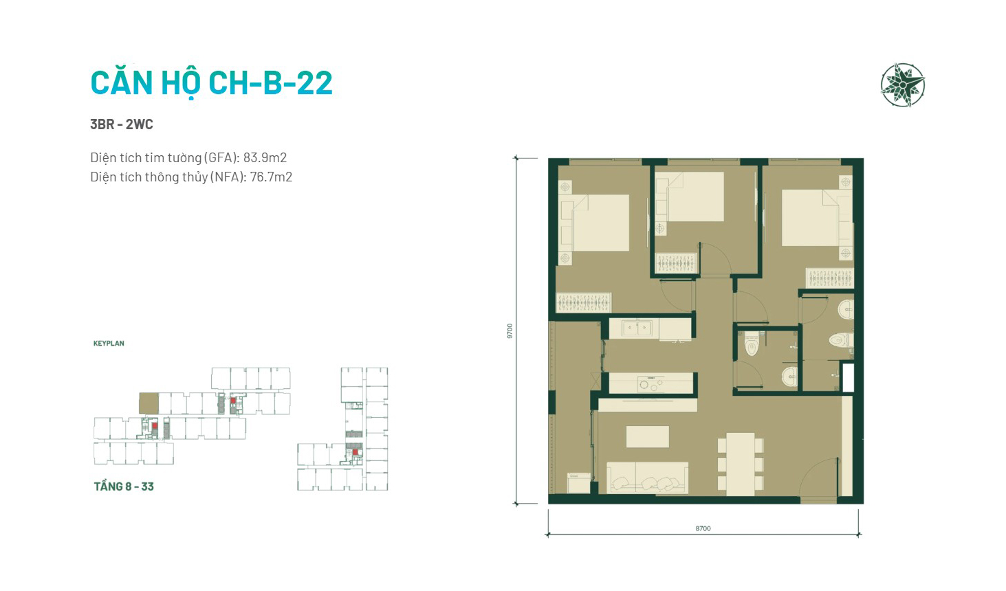 🏠 Diện tích: 84m² – Thiết kế 3 phòng ngủ, 2wc, căn góc 2 view thoáng, đón nắng gió tự nhiên